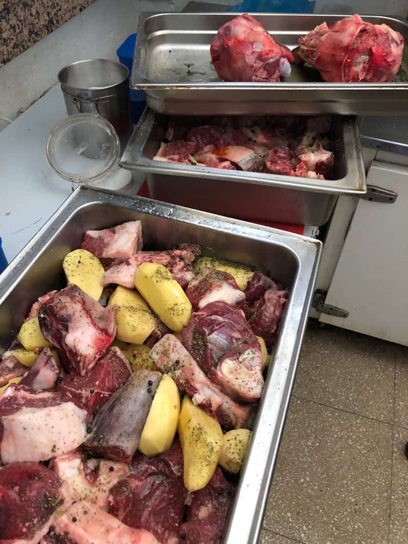 В качестве емкости для запекания можно использовать глиняные горшки, металлическую посуду, можно заворачивать порции в фольгу. Главное, чтобы блюдо было герметично закрыто — это необходимо, чтобы мясо не пересохло и получилось сочным. Мясо и картофель нарезают крупными кусками, обильно поливают оливковым маслом и добавляют специи.